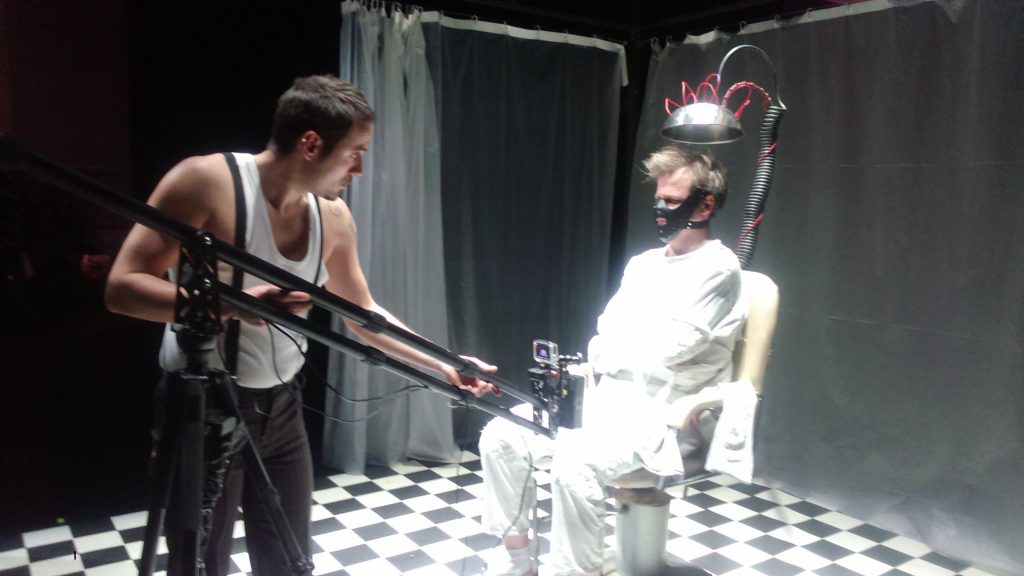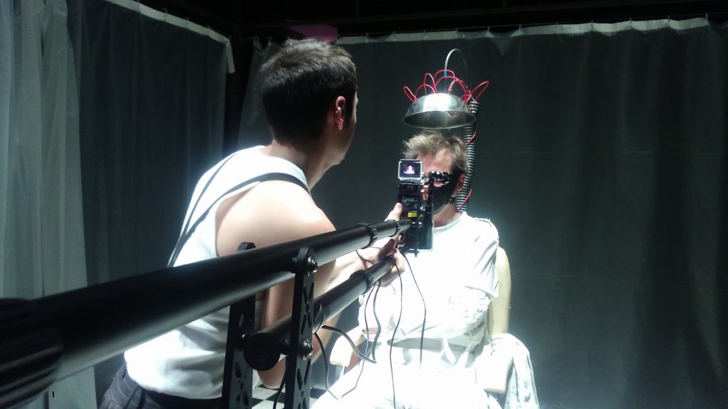 Caméra canon super 8 montée sur rig d’épaule, GOPRO fixée par Magicarm. Relié par Blackmagic converter en SDI à la régie vidéo